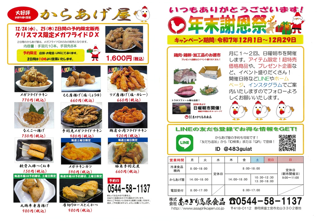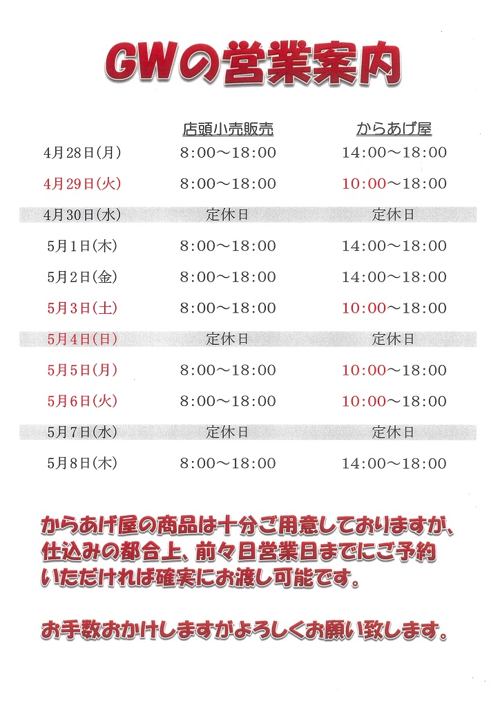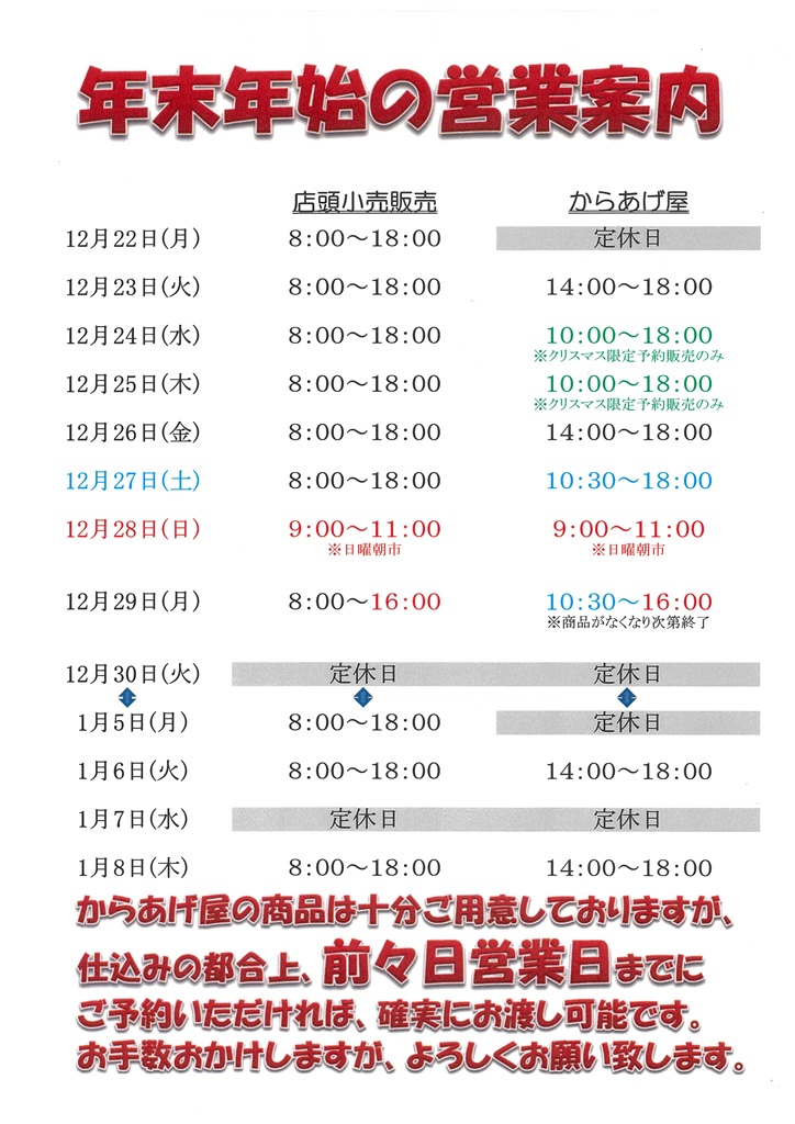 24日(水)の営業にともない、からあげ屋は22日(月)を