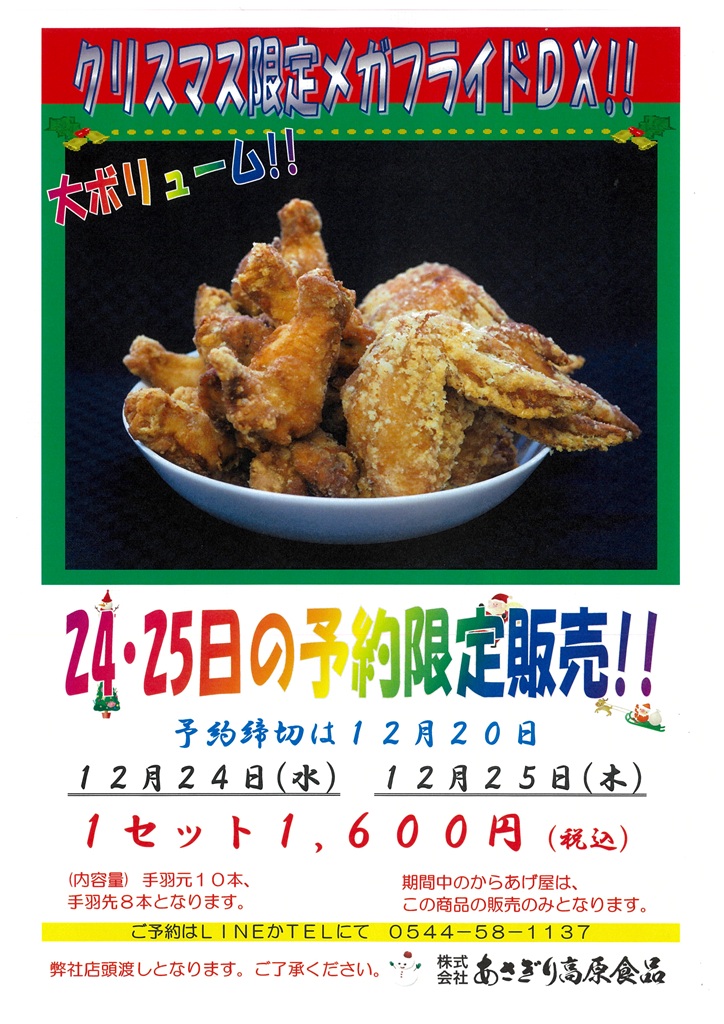 今回のクリスマス限定メガフライドDXは24日(水)・25日(木)の2日間となります。